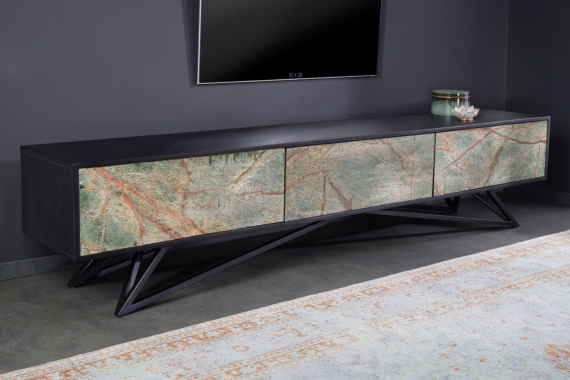 Czarne wykończenie w połączeniu z naturalną strukturą drewna i kamienia tworzy mocny, elegancki kontrast. To mebel, który świetnie odnajdzie się w nowoczesnych, loftowych i industrialnych wnętrzach, stanowiąc centralny punkt salonu.