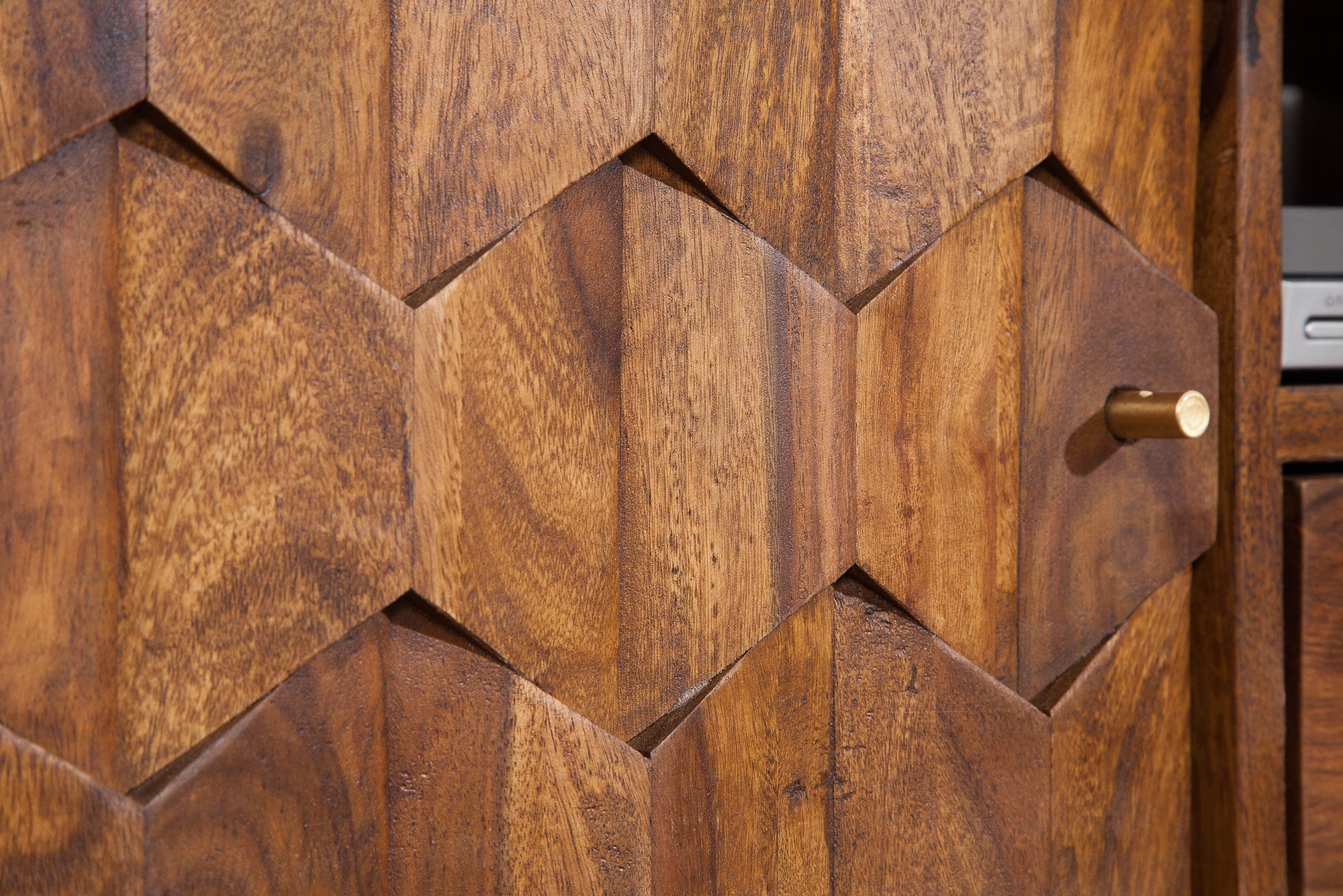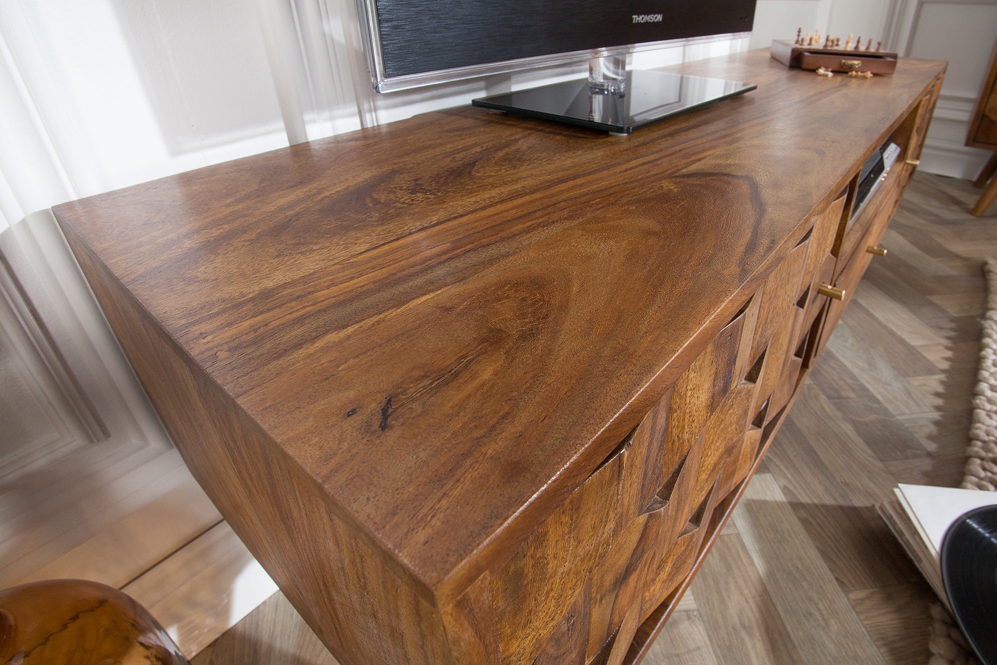 Szafka RTV MYSTIC LIVING 140 cm to solidny, naturalny mebel o wyrazistym charakterze, który łączy funkcjonalność z dekoracyjnym designem. Wykonana z litego drewna sheesham, wyróżnia się unikalnym usłojeniem i ciepłym, naturalnym kolorem, który pasuje zarówno do nowoczesnych, jak i bardziej klasycznych wnętrz.