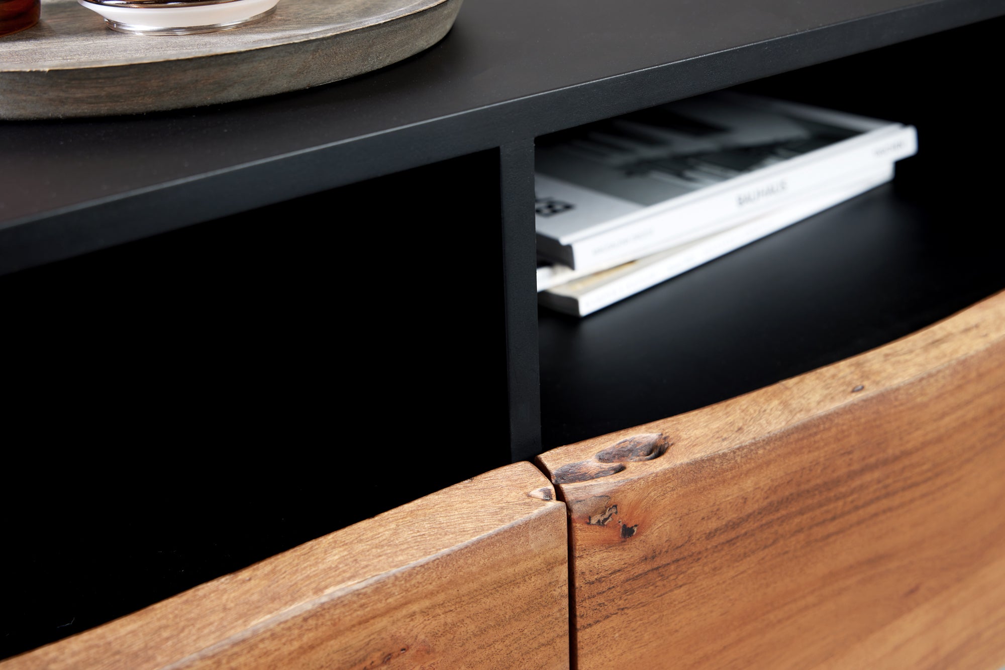 Nowoczesna szafka RTV o bardzo naturalnym i surowym charakterze, wykonana z litego drewna akacji. Model ORGANIC ARTWORK wyróżnia się frontami z zachowaną naturalną strukturą drewna oraz nieregularną krawędzią, co nadaje meblowi autentyczny i unikalny wygląd.