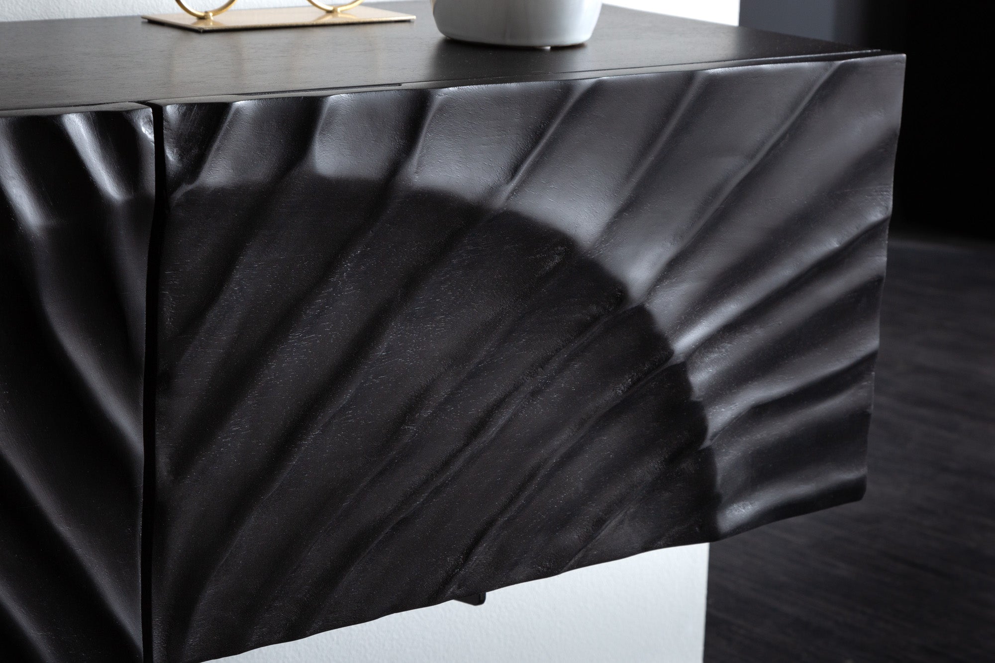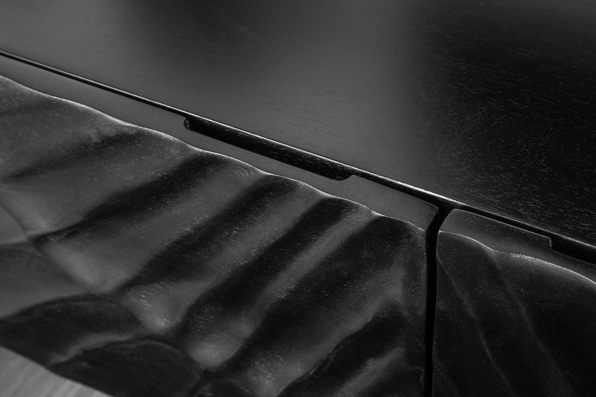 Nowoczesna szafka RTV o wyrazistej, designerskiej formie, która łączy naturalne drewno z mocnym, geometrycznym stylem. Wykonana z litego drewna mango w czarnym wykończeniu, przyciąga uwagę głęboką strukturą i eleganckim, matowym wyglądem.