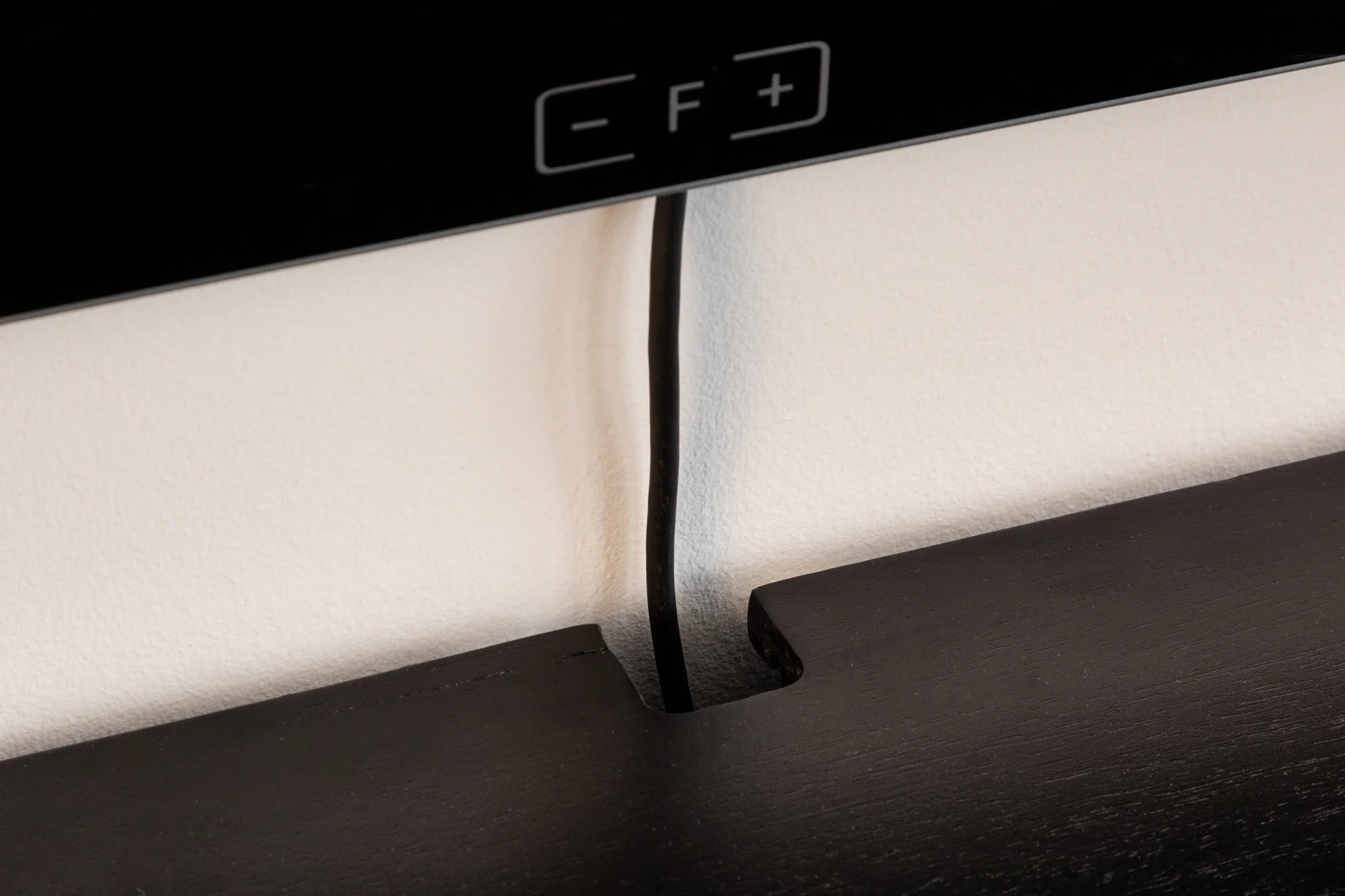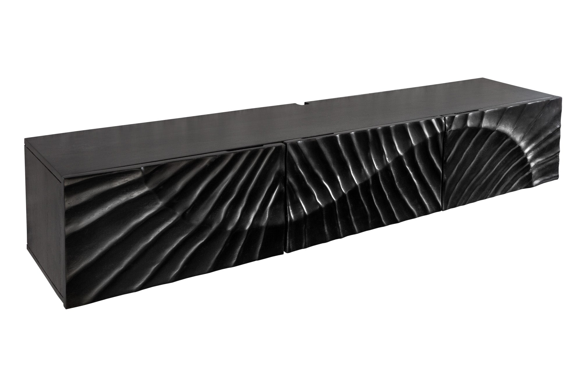 Najbardziej charakterystycznym elementem mebla są fronty z trójwymiarowym, ręcznie rzeźbionym wzorem, który tworzy efekt światłocienia i nadaje całości unikalnego charakteru. Każdy egzemplarz jest nieco inny, co podkreśla jego ekskluzywność. Wisząca konstrukcja dodaje lekkości i nowoczesności, a jednocześnie ułatwia utrzymanie porządku w salonie.