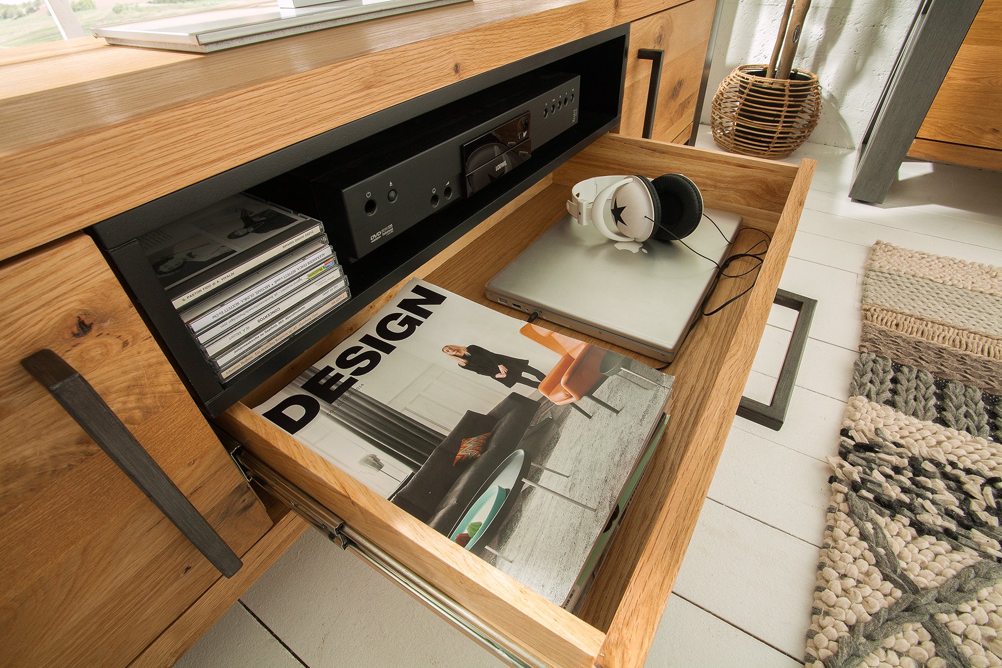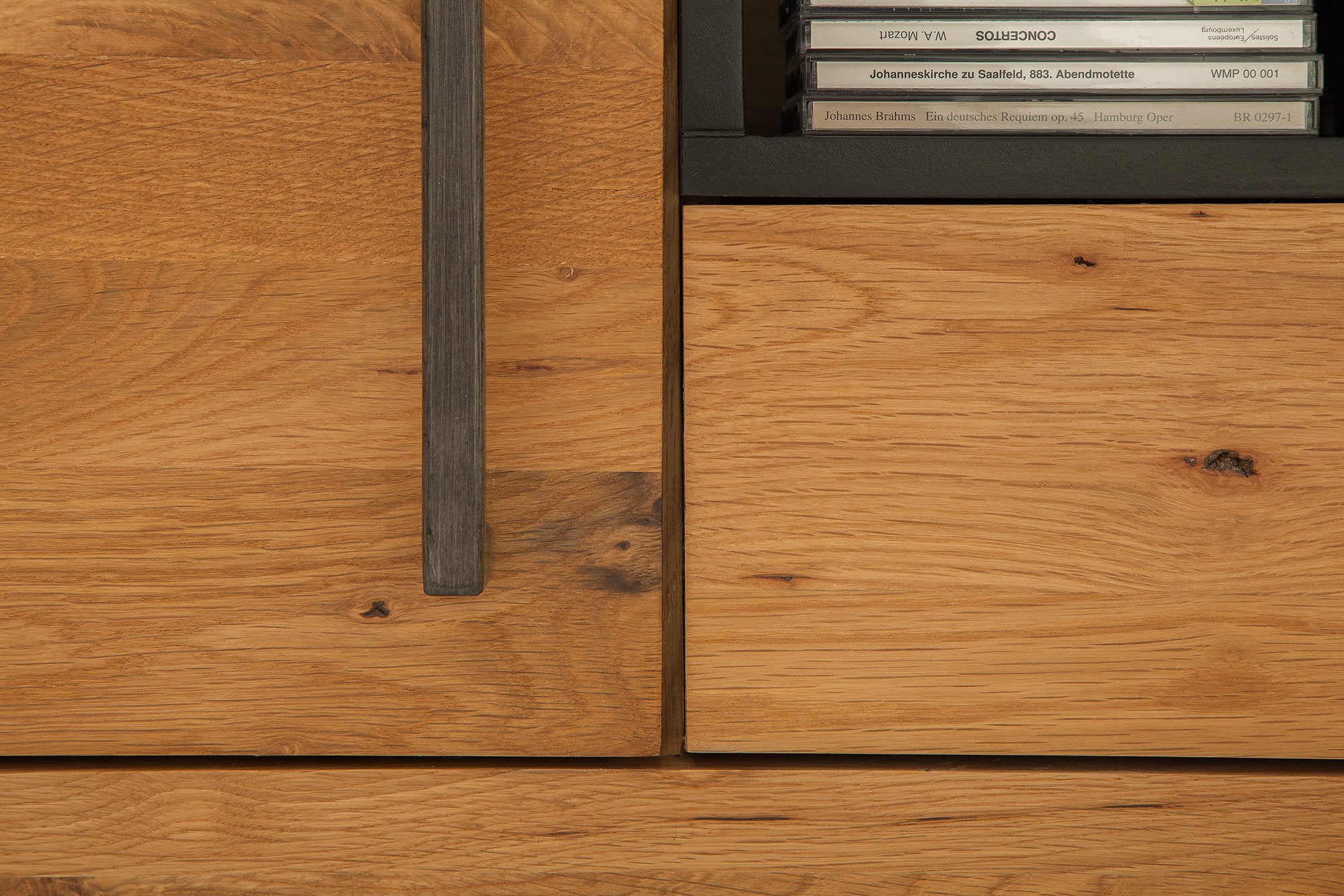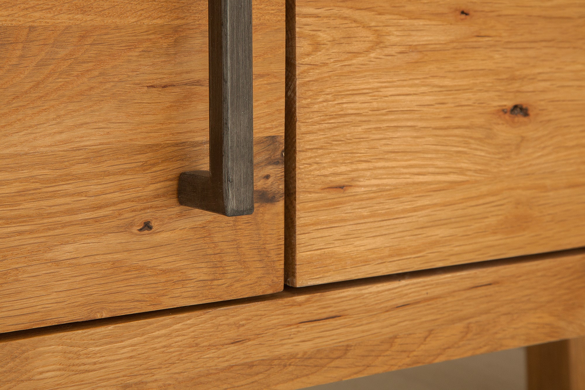 Szafka RTV THOR 200 cm to masywny, industrialny mebel, który łączy naturalne drewno z prostą, surową formą. Front wykonany z litego dębu dzikiego nadaje całości autentyczny wygląd, a olejowane wykończenie podkreśla strukturę słojów i naturalne detale drewna.