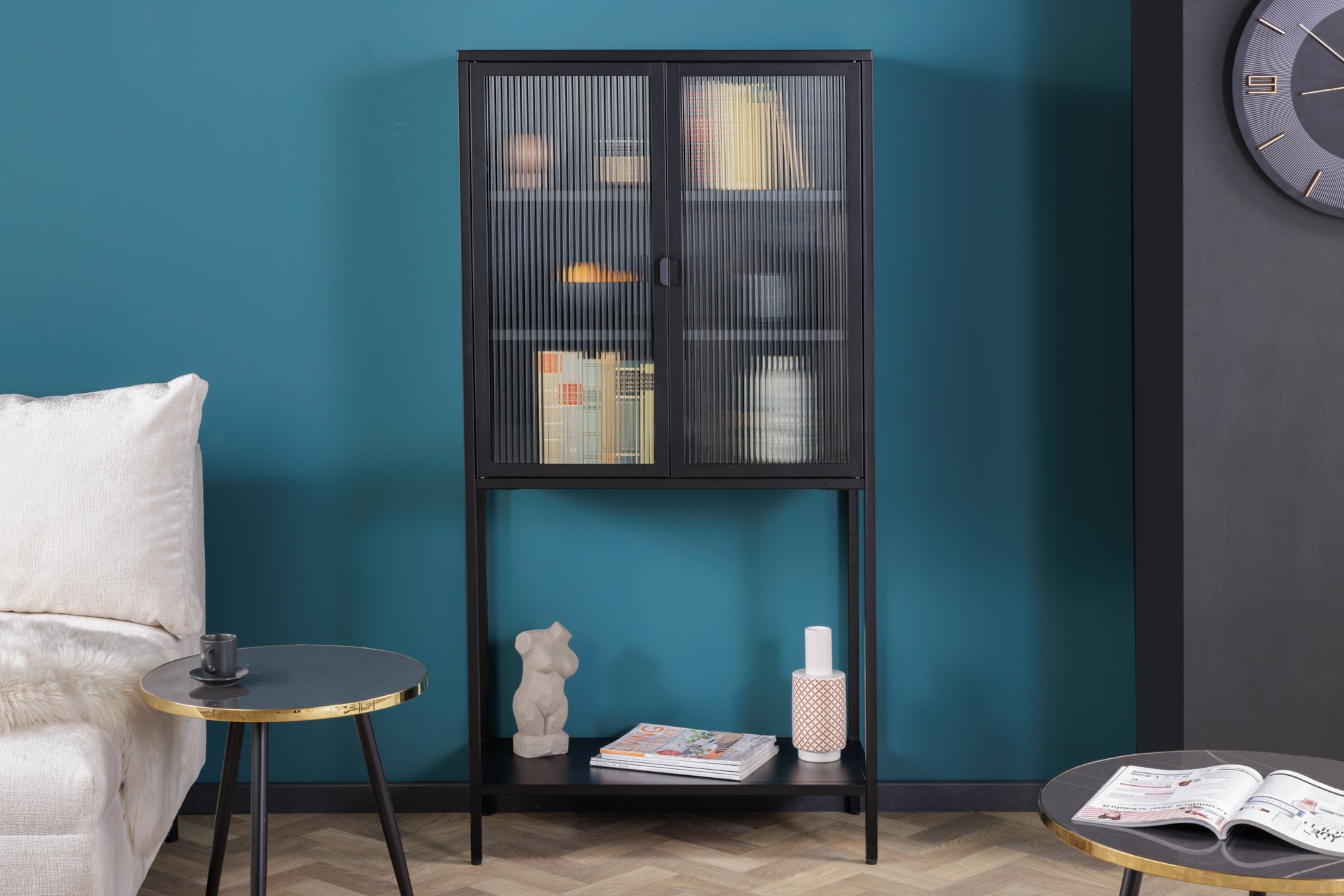 Najbardziej charakterystycznym elementem mebla są fronty ze szkła ryflowanego, które subtelnie rozpraszają światło i jednocześnie ograniczają pełną widoczność zawartości. Dzięki temu witryna łączy funkcję ekspozycyjną z lekką dyskrecją, tworząc bardzo stylowy efekt wizualny. Wnętrze wyposażone w półki zapewnia praktyczne miejsce na przechowywanie naczyń, dekoracji lub książek