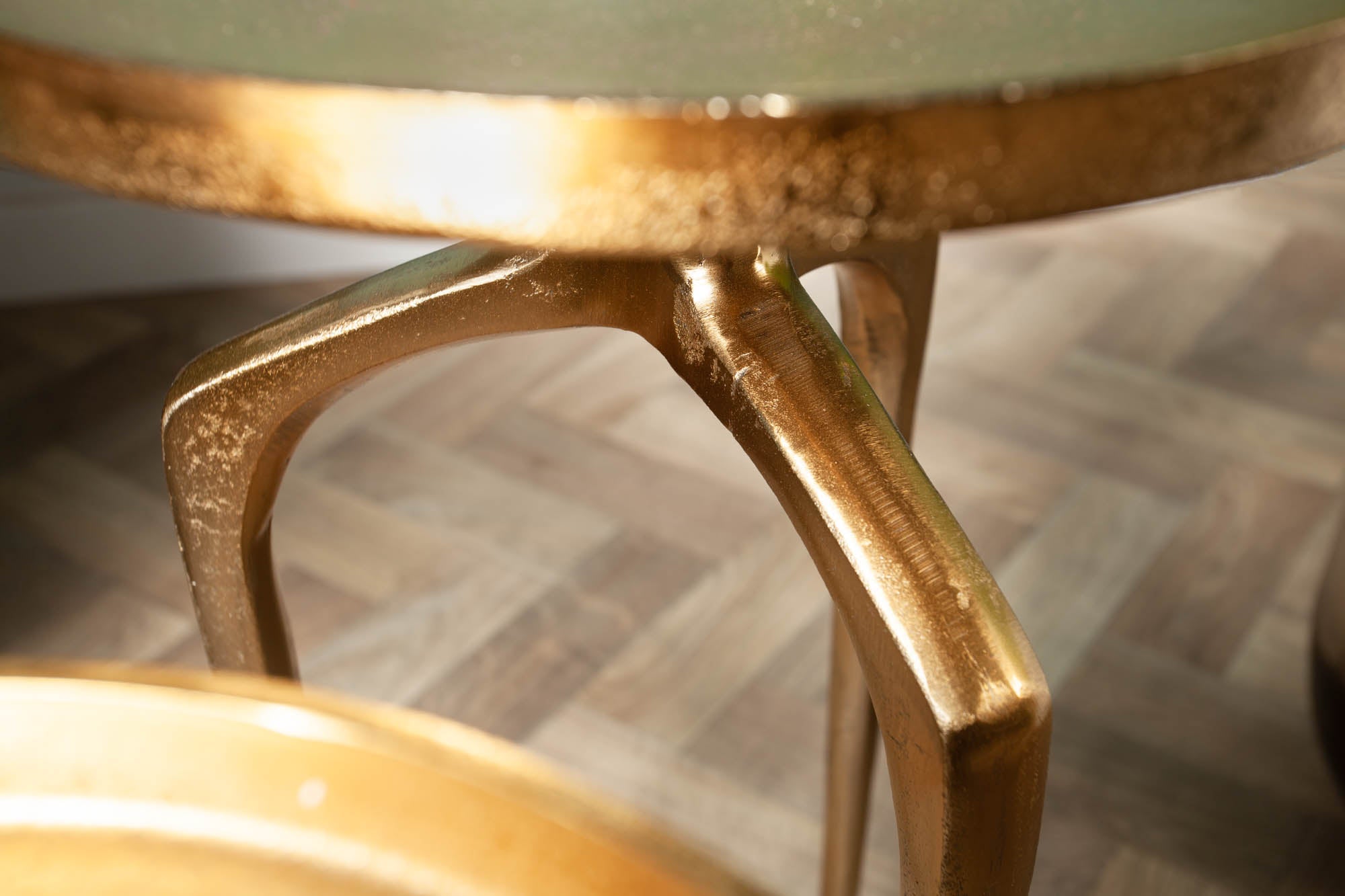 Nowoczesny zestaw dwóch stolików bocznych o geometrycznych formach, który łączy dekoracyjny wygląd z funkcjonalnością. Metalowa konstrukcja w eleganckim, złotym wykończeniu dodaje wnętrzu luksusowego charakteru, a różne wysokości stolików pozwalają na swobodne aranżowanie przestrzeni.