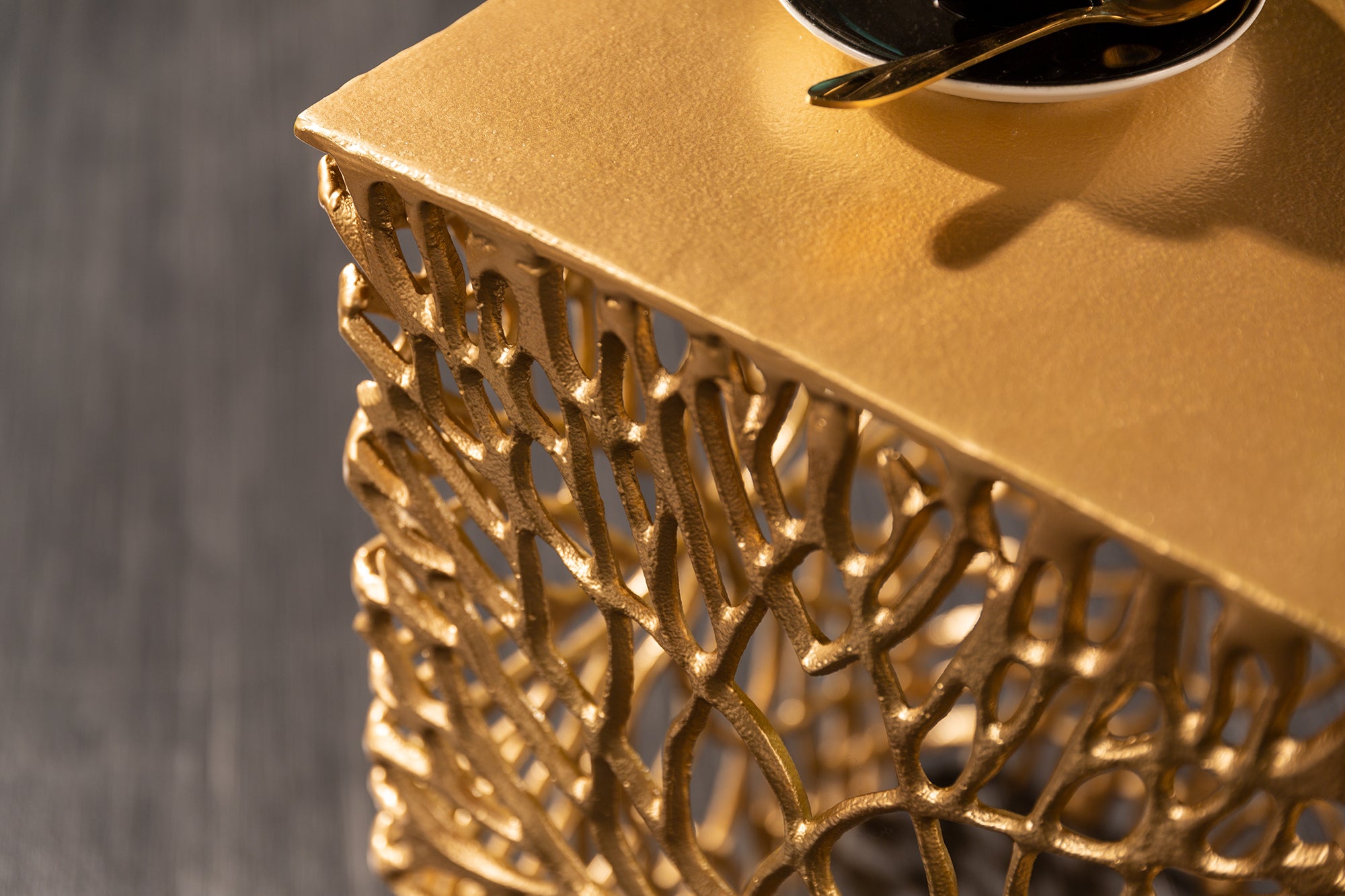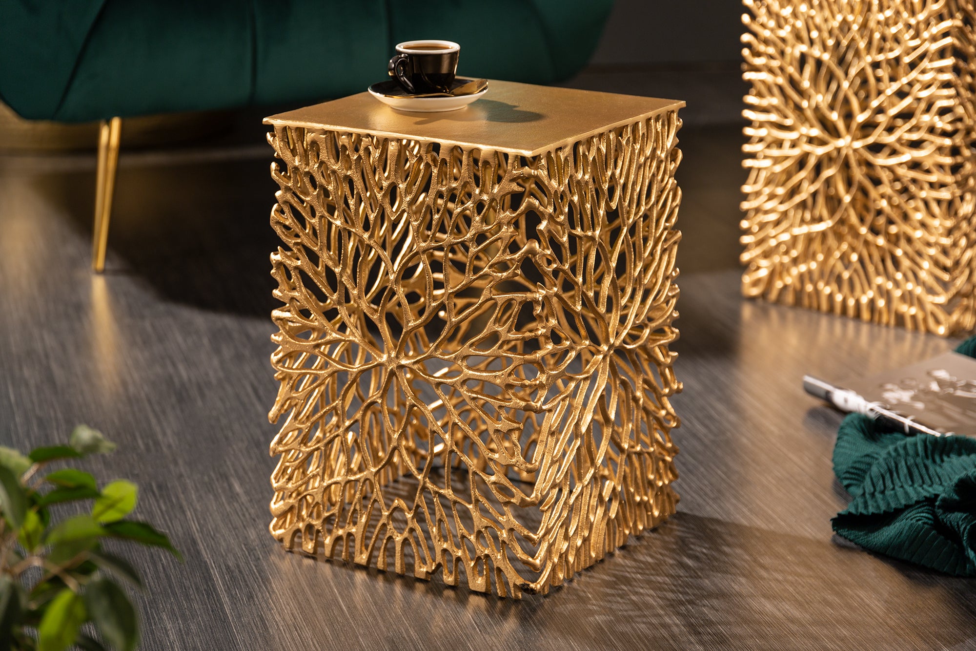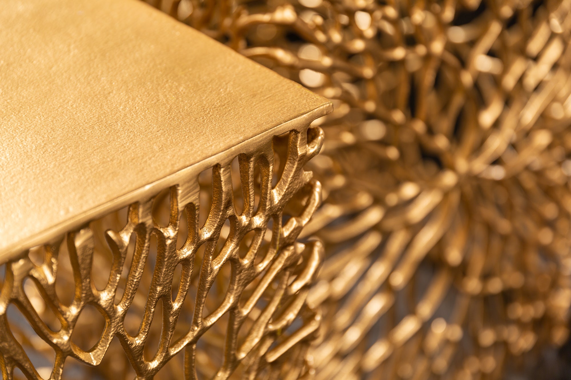 Elegancki zestaw dwóch stolików bocznych o inspirowanej naturą formie, które łączą dekoracyjny design z funkcjonalnością. Modele LEAF wyróżniają się blatem stylizowanym na kształt liścia oraz efektownym, złotym wykończeniem, które wprowadza do wnętrza luksusowy, dekoracyjny akcent.