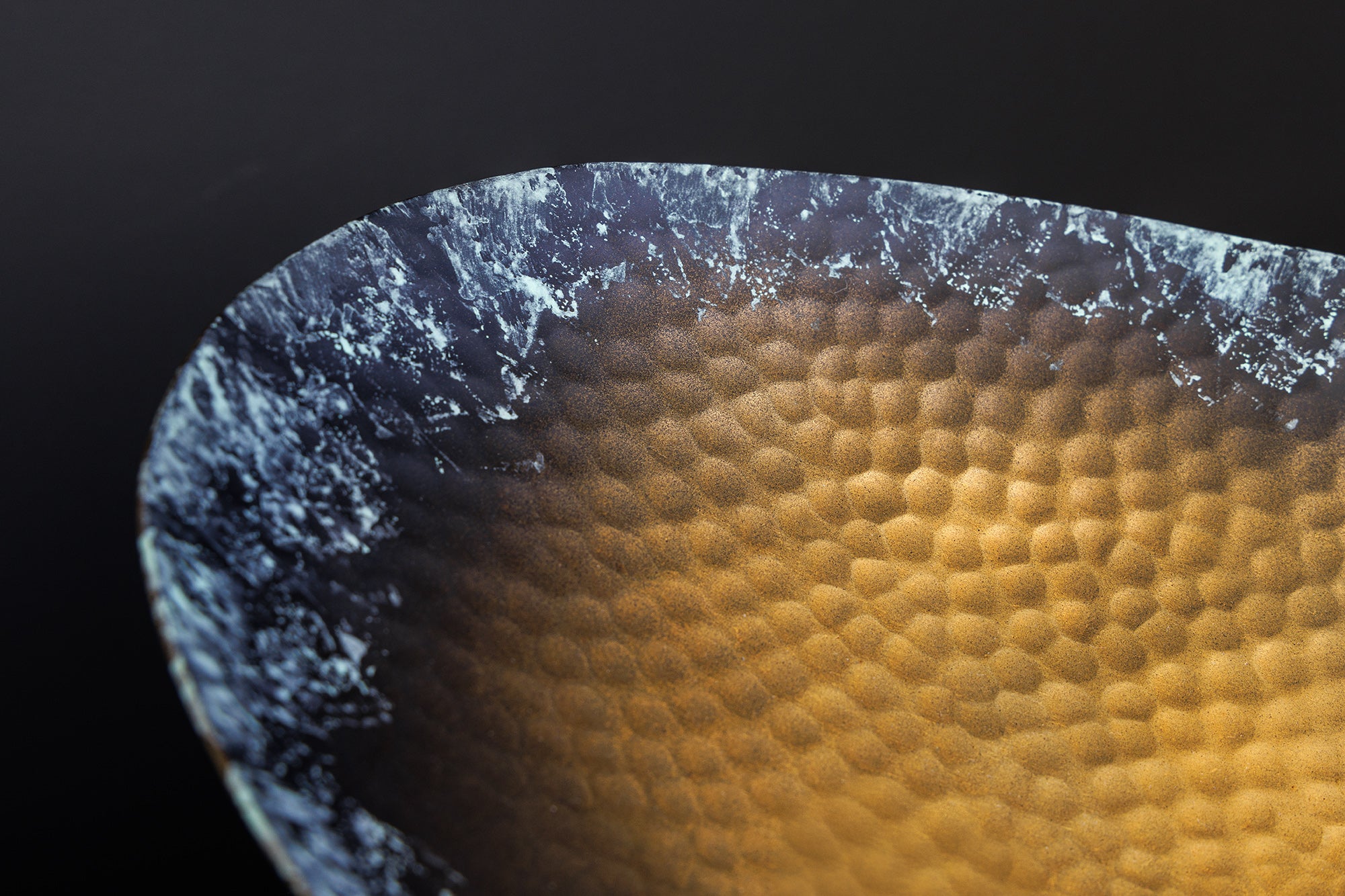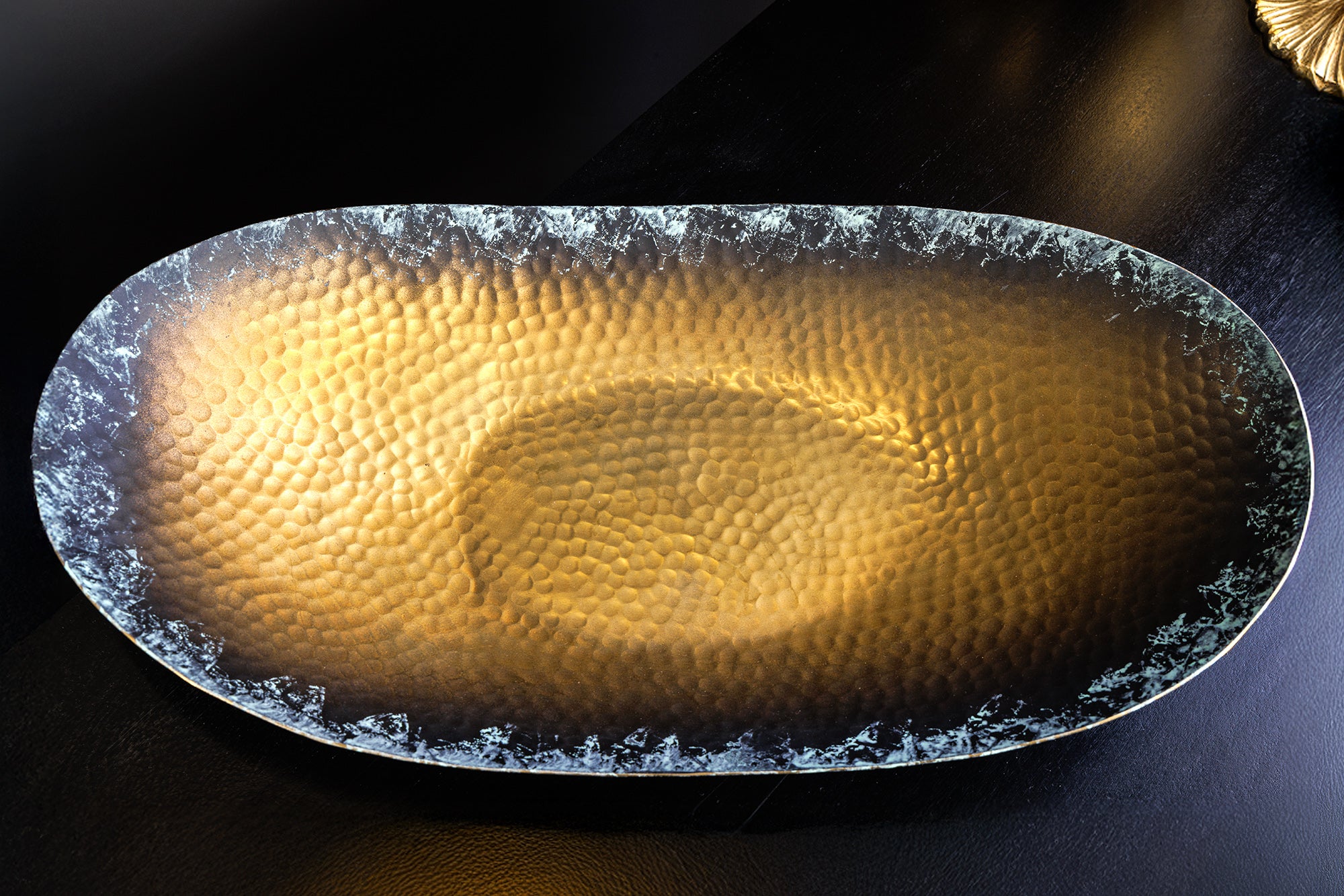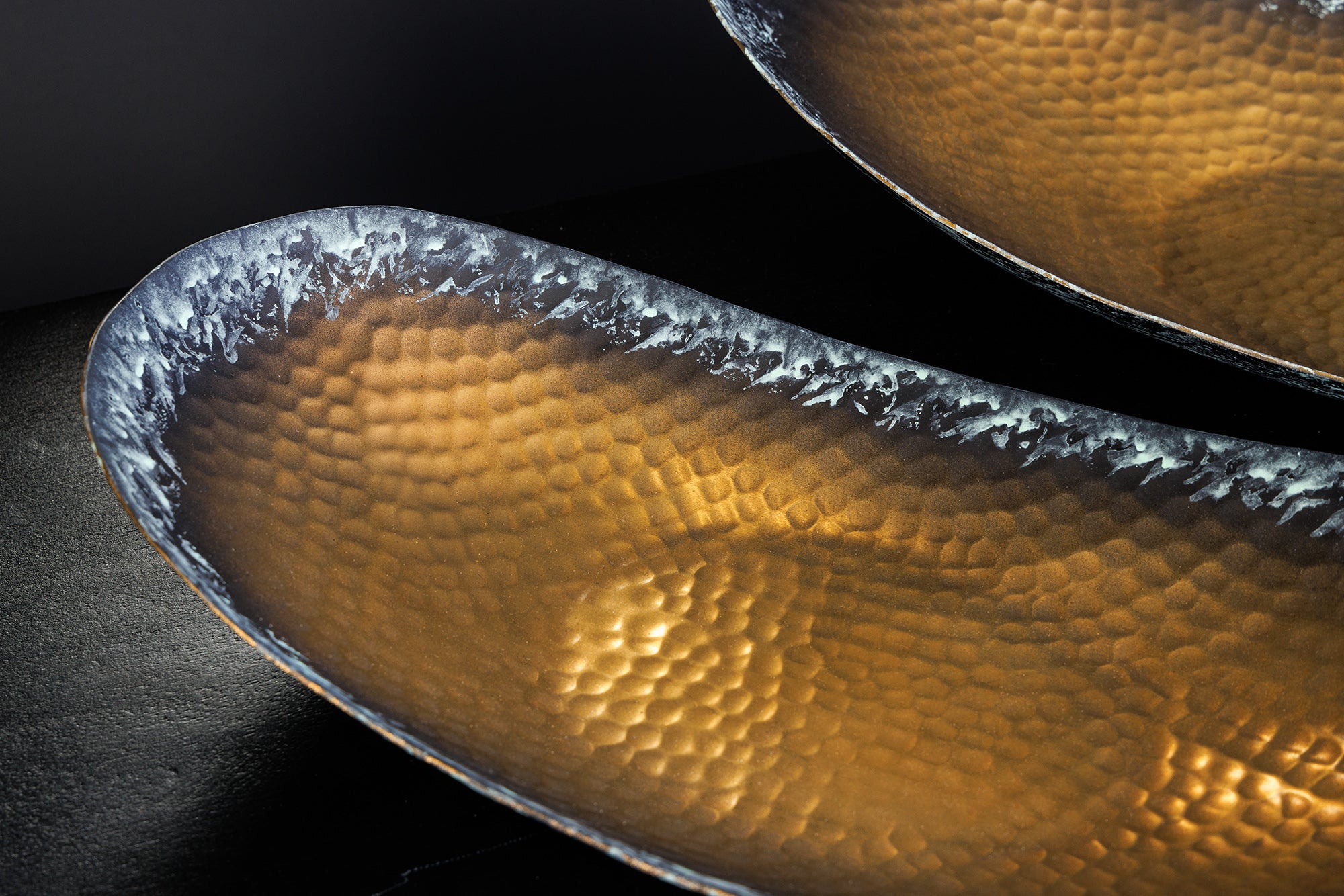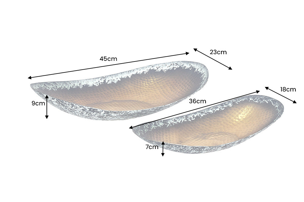 Najbardziej charakterystycznym elementem tego zestawu jest dekoracyjna powierzchnia z efektem hammer stroke, czyli młotkowania. Ręczne wykonanie sprawia, że każda misa może delikatnie różnić się wykończeniem, co podkreśla jej indywidualny charakter. Komplet świetnie sprawdzi się jako ozdoba stołu, komody, konsoli, regału lub blatu w salonie, jadalni czy holu.