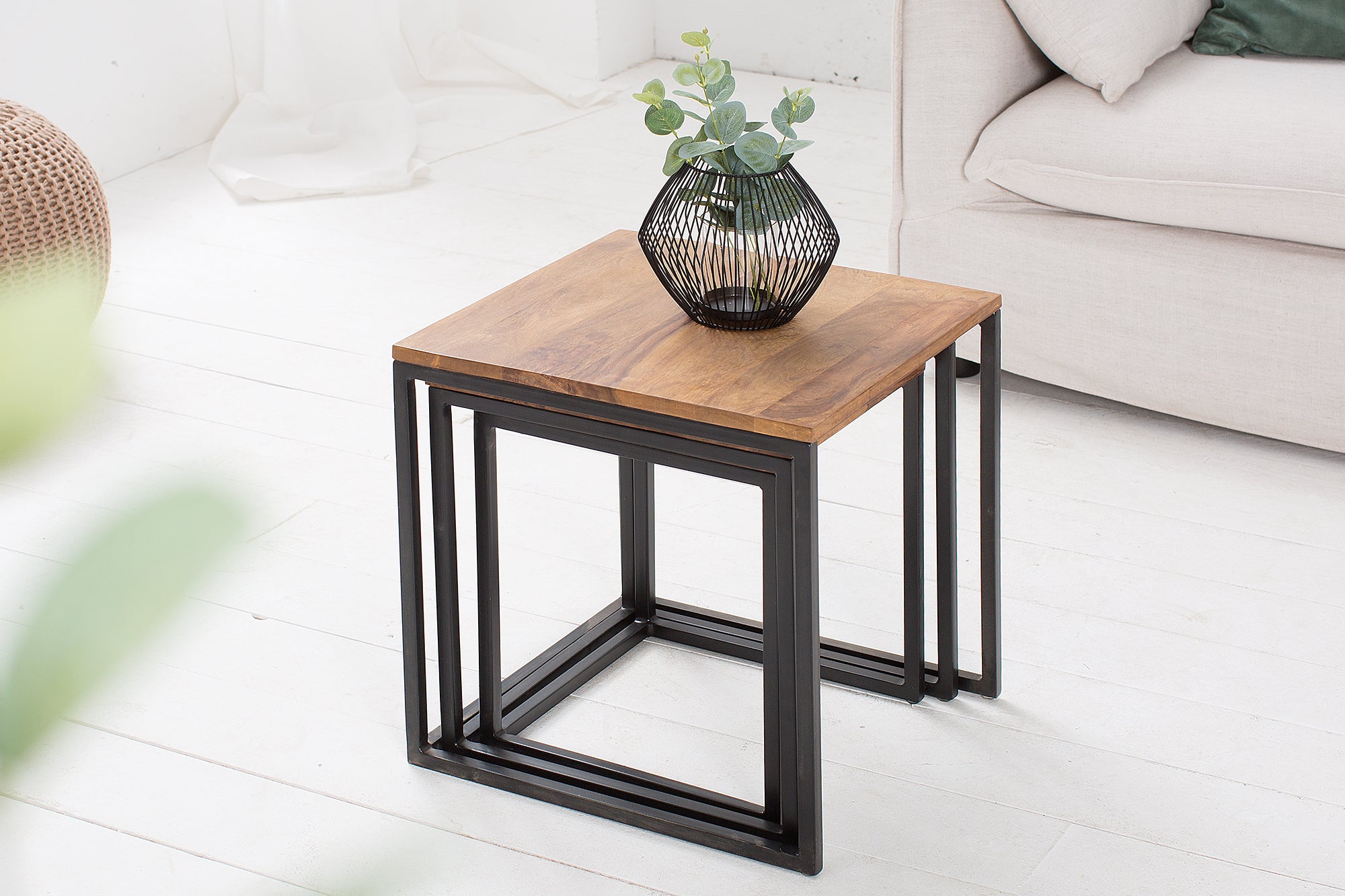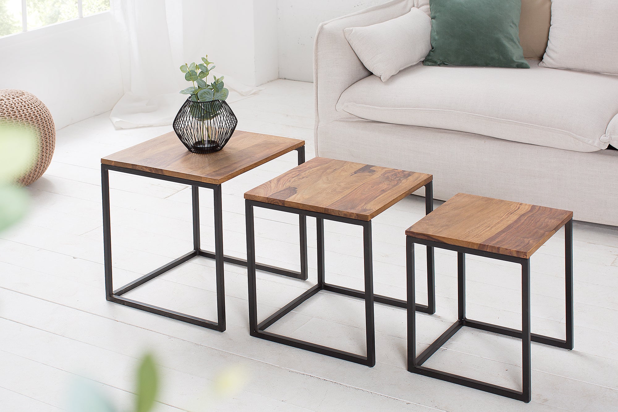 Stylowy zestaw trzech stolików pomocniczych wykonanych z litego drewna sheesham, znanego również jako palisander indyjski. Drewno to wyróżnia się wyjątkowym usłojeniem oraz wysoką trwałością, dzięki czemu każdy stolik posiada niepowtarzalny rysunek i naturalny charakter. Lakierowana powierzchnia podkreśla piękno drewna oraz zabezpiecza je przed codziennym użytkowaniem.
