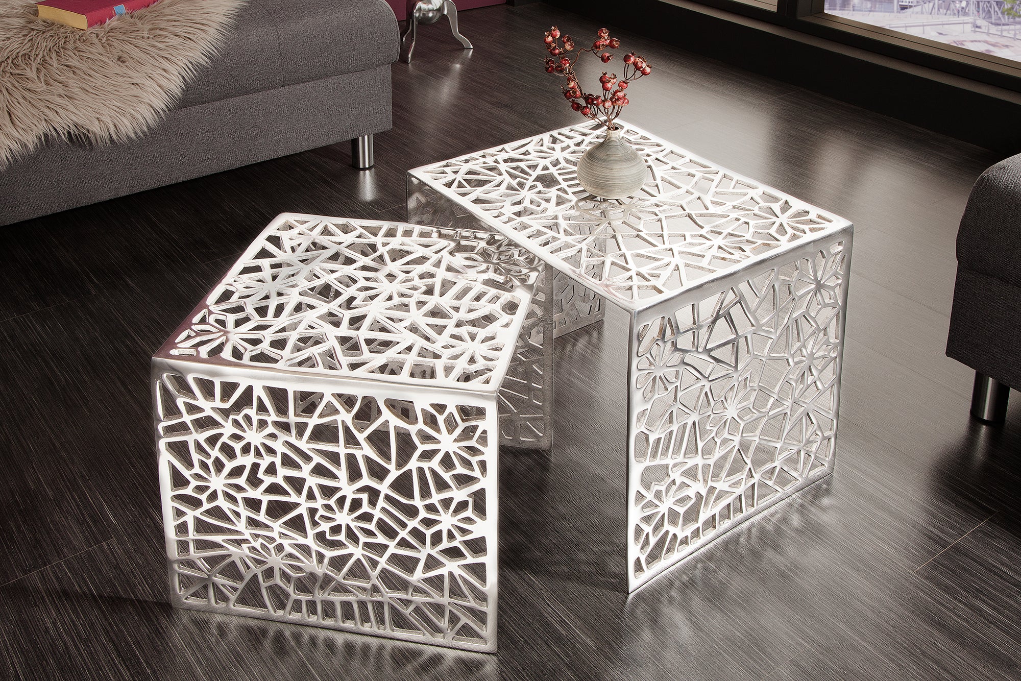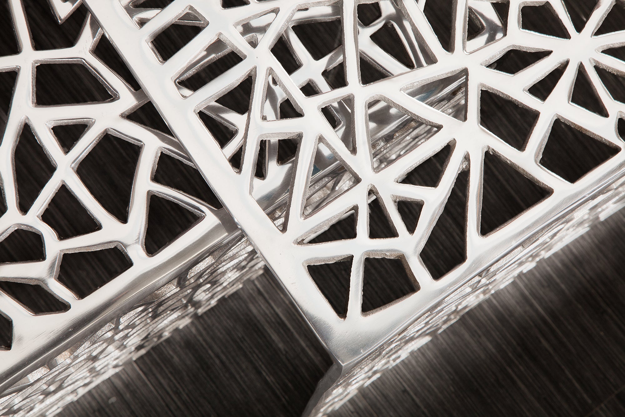 Designerski zestaw dwóch stolików kawowych o wyjątkowej, abstrakcyjnej formie. Stoliki wykonane są w całości z wysokiej jakości stopu aluminium, dzięki czemu są trwałe, stabilne i jednocześnie stosunkowo lekkie. Metaliczna, srebrna powierzchnia nadaje im elegancki, nowoczesny charakter, który doskonale pasuje do wnętrz w stylu glamour, loftowym oraz nowoczesnym.