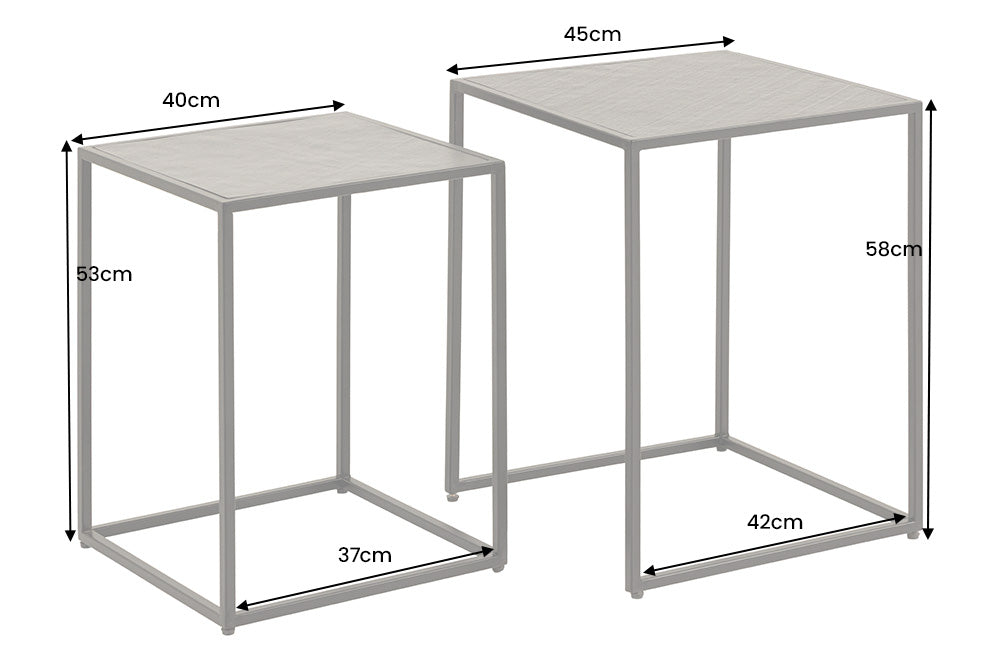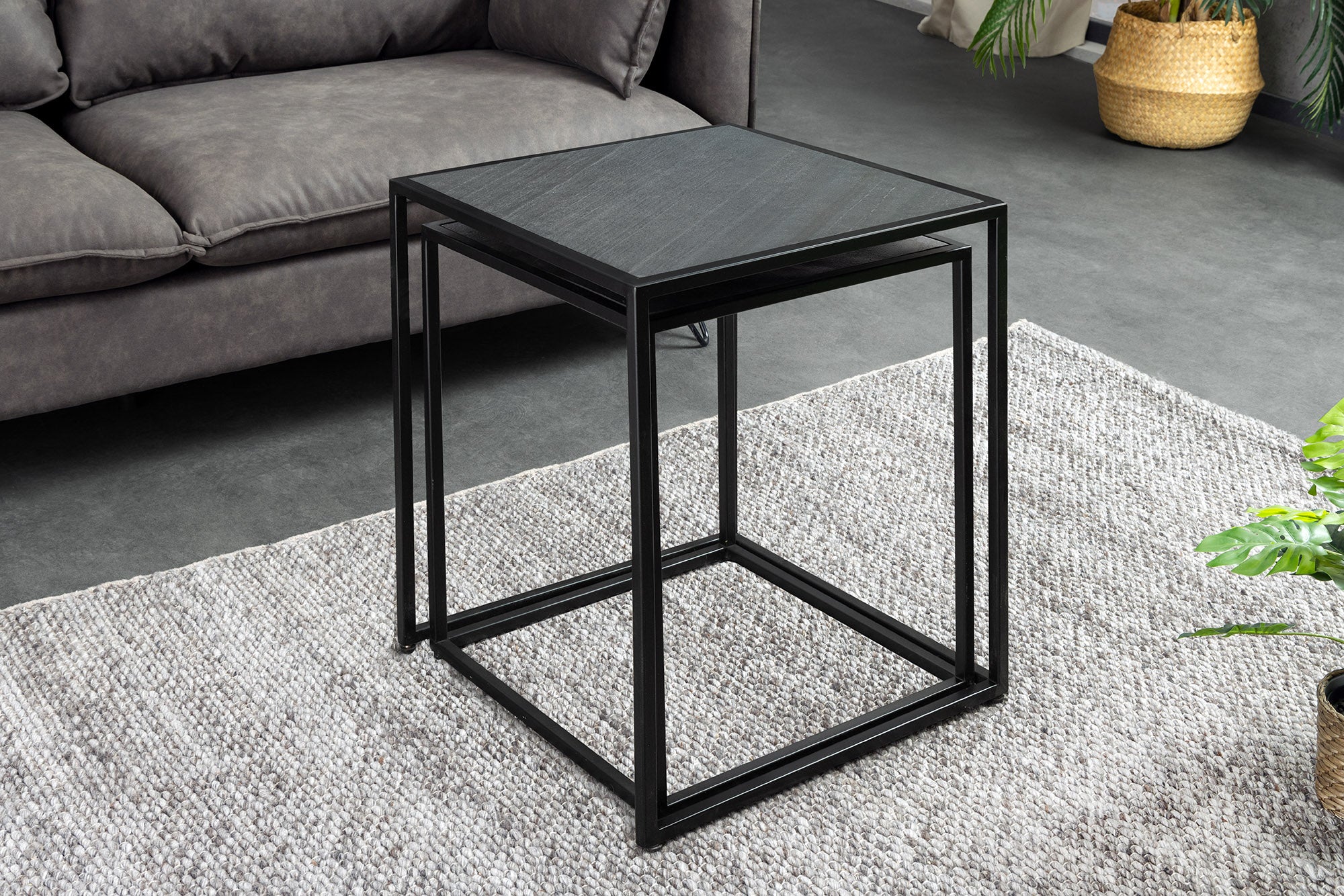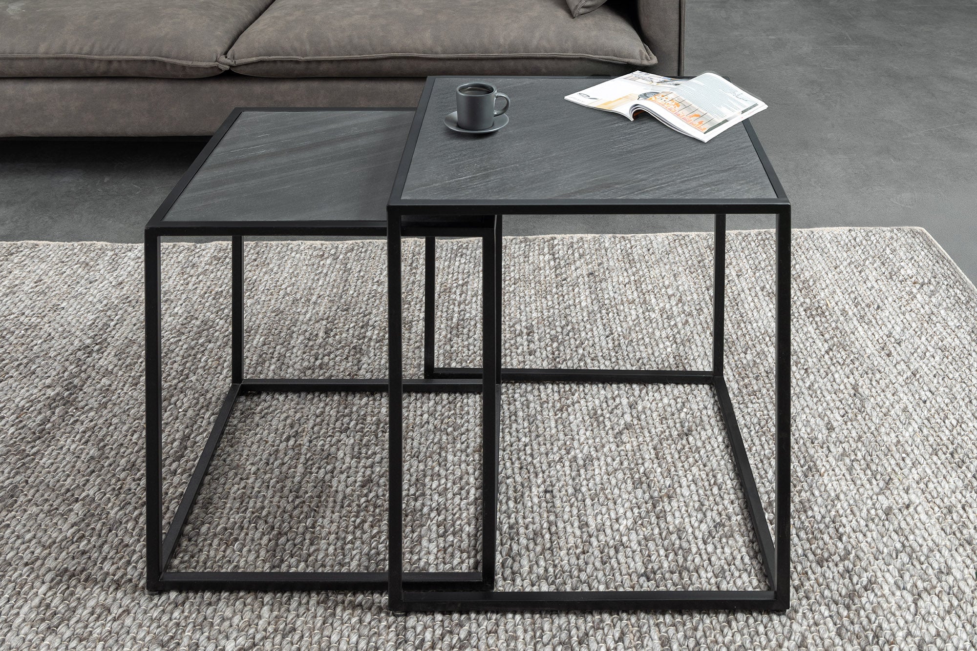 Nowoczesny zestaw dwóch stolików kawowych marki Invicta Interior, wyróżniający się eleganckim blatem o wyglądzie czarnego marmuru. Różne rozmiary stolików pozwalają ustawić je razem w formie praktycznego kompletu lub osobno – jako stolik główny i pomocniczy.