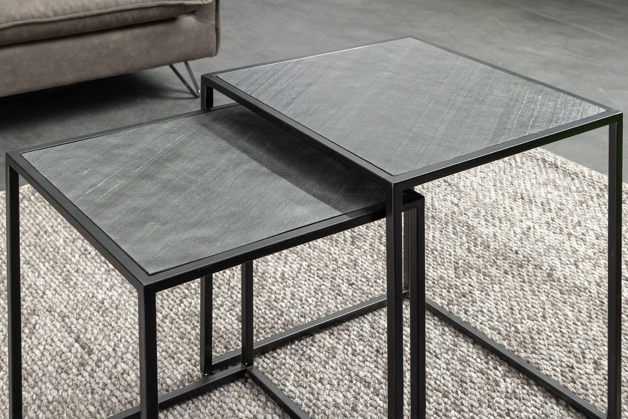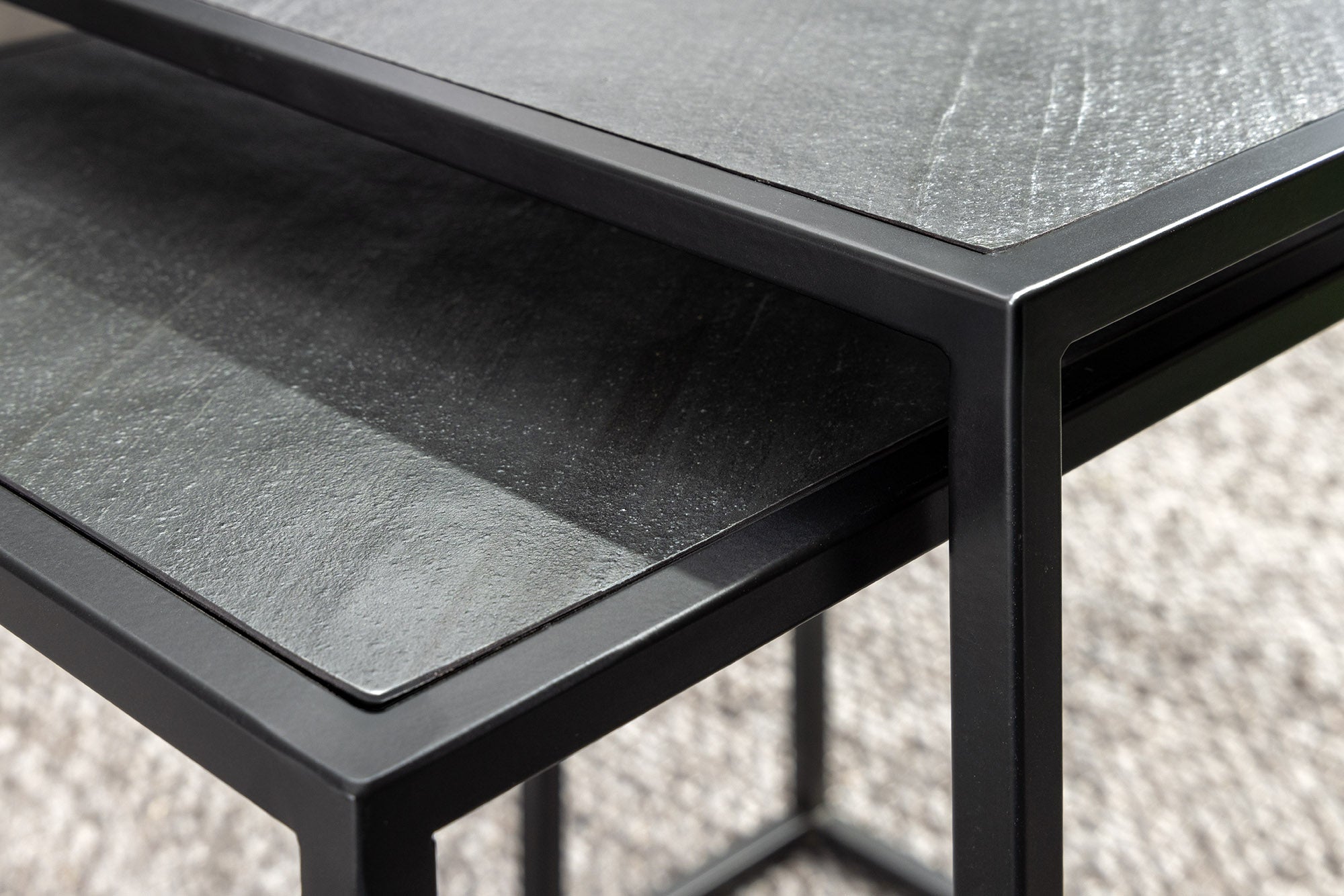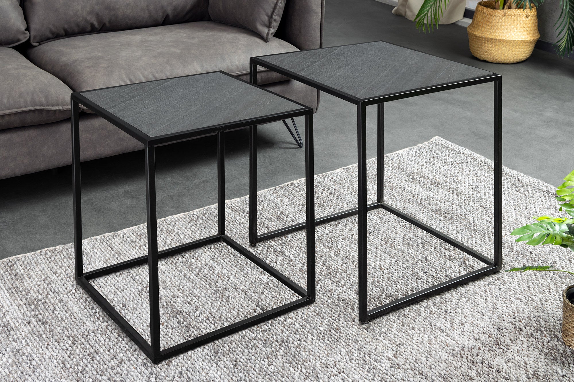 Nowoczesny zestaw dwóch stolików kawowych marki Invicta Interior, wyróżniający się eleganckim blatem o wyglądzie czarnego marmuru. Różne rozmiary stolików pozwalają ustawić je razem w formie praktycznego kompletu lub osobno – jako stolik główny i pomocniczy.