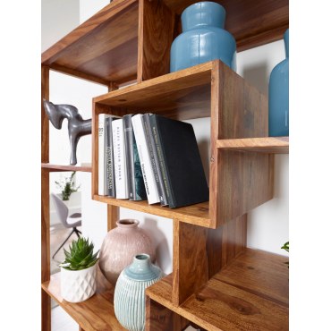 Elegancki regał wykonany z naturalnego drewna Sheesham zachwyca wyrazistym rysunkiem słojów i wyjątkowym charakterem. Trzy zintegrowane kubiki tworzą nowoczesną formę i oferują wiele możliwości aranżacyjnych – idealne do salonu, biura czy sypialni.