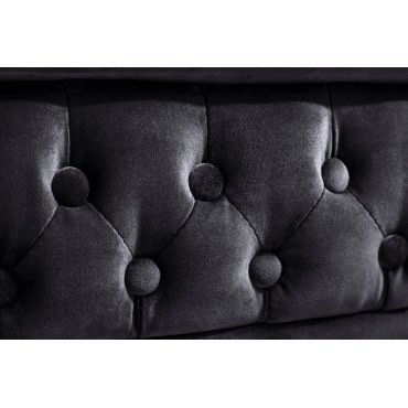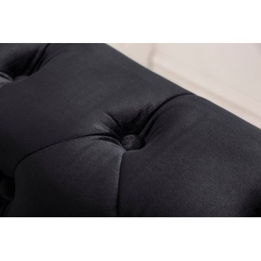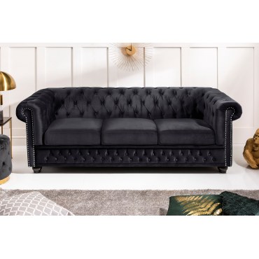 Ponadczasowa elegancja i wygoda. Czarne, welurowe CHESTERFIELD łączy klasyczne pikowania z komfortowym siedziskiem na sprężynach (Federkern). Dekoracyjne mosiężne pinezki i drewniane, ciemnobrązowe nóżki dodają wnętrzu szlachetnego charakteru.