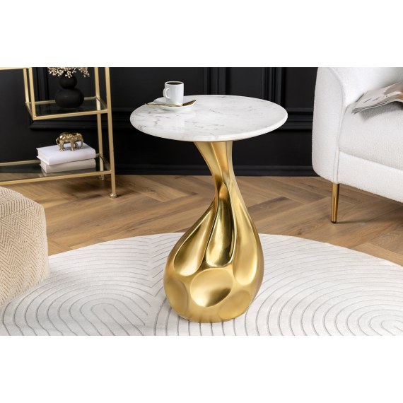 Stolik boczny TEAR to elegancki i wyrafinowany mebel, który zachwyca prostotą formy i luksusowym wykończeniem. Połączenie blatu z naturalnego białego marmuru z unikalną, złotą podstawą tworzy wyjątkowy akcent dekoracyjny w każdym wnętrzu.