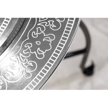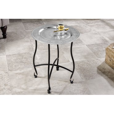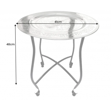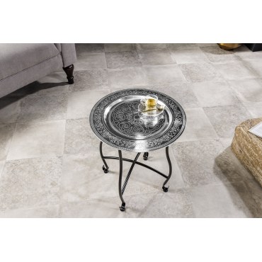 Stolik MARRAKESCH o średnicy 50 cm to elegancki mebel, który łączy orientalny design z praktycznością. Srebrna, bogato zdobiona taca i składana metalowa podstawa czynią go idealnym dodatkiem do wnętrz w stylu boho, orientalnym lub klasycznym.
