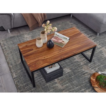 Ten nowoczesny stolik kawowy to połączenie solidnego drewna sheesham i czarnego metalu w modnym stylu industrialnym. Ciepła, naturalna barwa drewna oraz jego wyjątkowe usłojenie wprowadzają do wnętrza przytulny klimat. Każdy egzemplarz to ręcznie wykonany unikat, dzięki czemu masz pewność, że Twój stolik jest jedyny w swoim rodzaju.