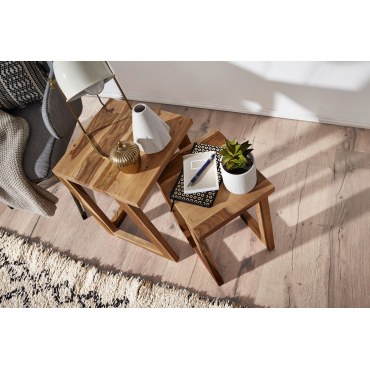 Ten elegancki komplet stolików z litego drewna Sheesham zachwyca naturalnym usłojeniem oraz praktyczną konstrukcją. Mniejszy stolik można wsunąć pod większy, co pozwala zaoszczędzić miejsce i elastycznie dopasować ustawienie do wnętrza.