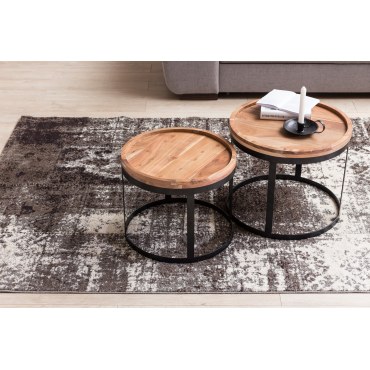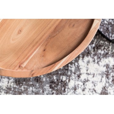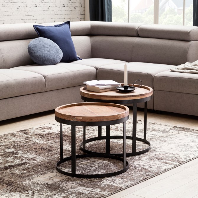 Nowoczesny zestaw dwóch stolików pomocniczych łączy klasyczny design z industrialnym charakterem. Ciepła kolorystyka drewna akacjowego i eleganckie metalowe podstawy nadają wnętrzu przytulnego, a zarazem stylowego wyglądu. Idealne jako stoliki kawowe, boczne lub dekoracyjne.