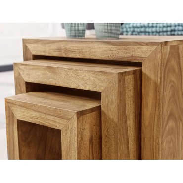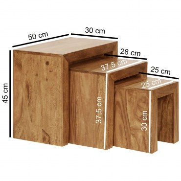 Ten trzyczęściowy zestaw stolików wykonany z litego drewna akacjowego to idealne połączenie funkcjonalności i stylowego designu. Wyjątkowa struktura drewna oraz staranne ręczne wykonanie czynią każdy stolik unikalnym egzemplarzem. Stoliki mogą być użytkowane razem lub oddzielnie – jako element dekoracyjny, stolik boczny lub pomocniczy.