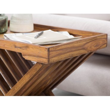 Praktyczny i elegancki stolik składany wykonany z litego drewna Sheesham. Wyjątkowe usłojenie drewna oraz ręczne wykonanie sprawiają, że każdy egzemplarz jest niepowtarzalny. Funkcjonalna zdejmowana taca z rantem oraz stabilna podstawa w kształcie litery "X" czynią ten mebel doskonałym zarówno do codziennego użytku, jak i na wyjątkowe okazje.