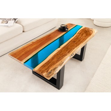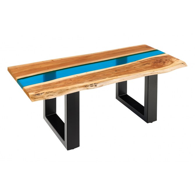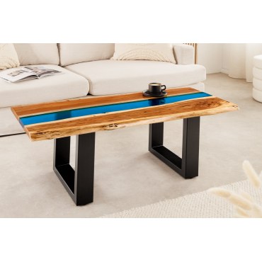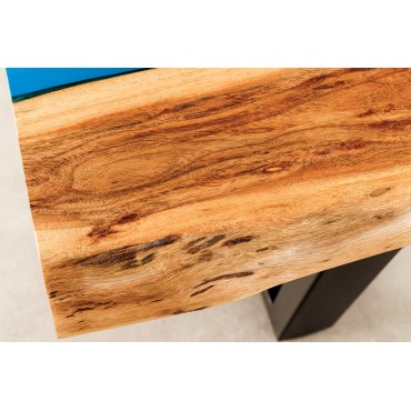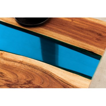 Efektowny stolik kawowy, który łączy naturalne piękno drewna akacjowego z nowoczesnym akcentem niebieskiej żywicy epoksydowej. Unikatowy „płynny” pas żywicy biegnący przez blat przyciąga wzrok i podkreśla charakter mebla. Naturalna krawędź sprawia, że każdy egzemplarz jest jedyny w swoim rodzaju.