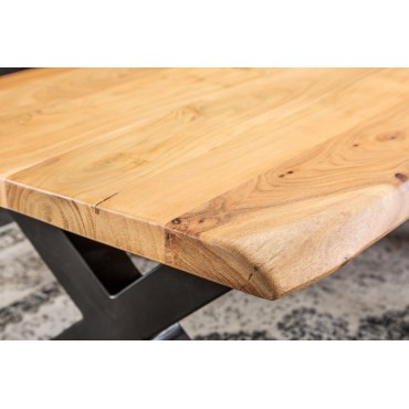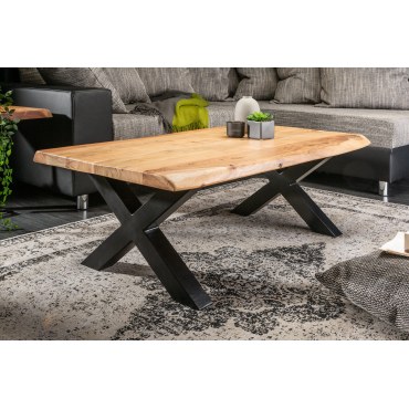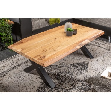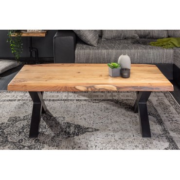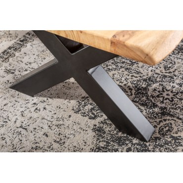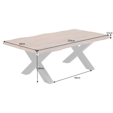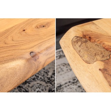 Nowoczesny i efektowny stolik kawowy Mammut 110 cm wykonany z litego drewna akacjowego z naturalnym wykończeniem. Blat o grubości około 35 mm podkreśla naturalną strukturę drewna i tworzy wyjątkowy, naturalny wygląd. Stolik łączy w sobie elegancję drewna z industrialnym charakterem metalowej ramy i nóg, co sprawia, że doskonale pasuje do salonu, pokoju dziennego czy przestrzeni wypoczynkowej.