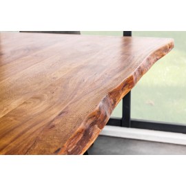 Wykonane z litego drewna sheesham z naturalną krawędzią drzewa i ramą z metalu malowanego proszkowo o surowym, industrialnym wyglądzie.