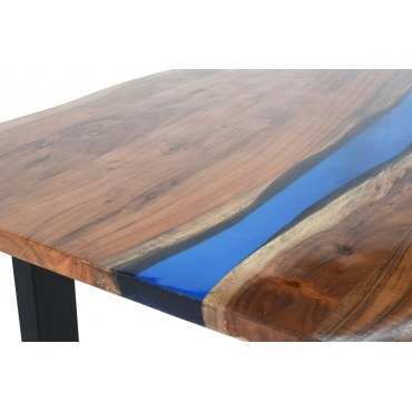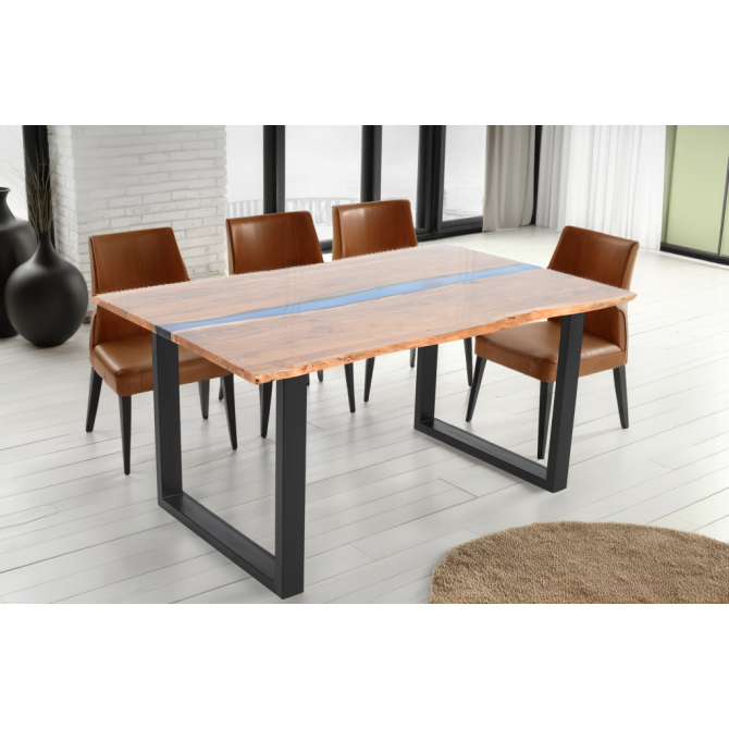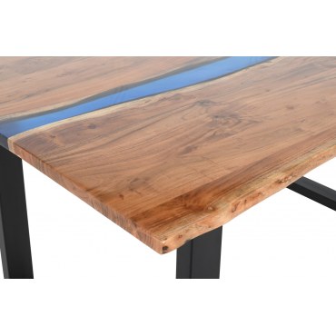 Stół COAST to wyjątkowy mebel, który łączy naturalne piękno drewna akacjowego z nowoczesnym akcentem niebieskiej żywicy epoksydowej. Blat o długości 160 cm wykonany z litego drewna akacjowego prezentuje unikalne usłojenie i naturalną krawędź, co nadaje każdemu egzemplarzowi indywidualny charakter. Wstawka z niebieskiej żywicy epoksydowej przypomina rzekę, wprowadzając do wnętrza świeżość i oryginalność.