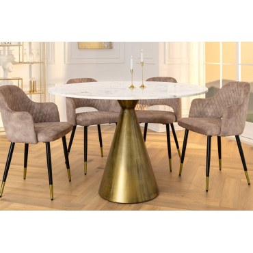 Solidna podstawa z metalu malowanego proszkowo w kolorze miedzianym nie tylko gwarantuje stabilność, ale również dodaje luksusowego charakteru całej konstrukcji. Kompaktowy rozmiar sprawia, że stół doskonale sprawdzi się w mniejszych jadalniach, kuchniach lub przestrzeniach o ograniczonej powierzchni, zapewniając komfortowe miejsce dla 4 osób.
