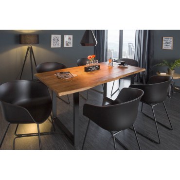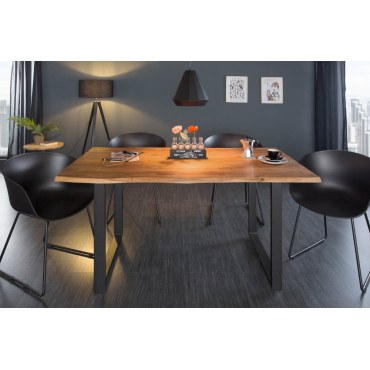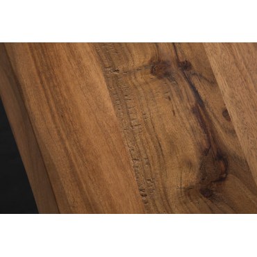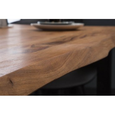 Stół MAMMUT to stylowe połączenie surowej natury i nowoczesnego designu. Wykonany z litego drewna akacjowego o grubości 26 mm, blat prezentuje autentyczną strukturę drewna z zachowaną naturalną krawędzią, co sprawia, że każdy egzemplarz jest unikatowy. Lakierowana powierzchnia wydobywa głębię koloru i chroni drewno przed uszkodzeniami.