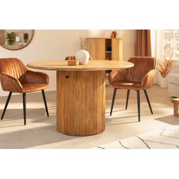 Elegancki, nowoczesny stół okrągły wykonany z litego drewna mango. Naturalne, ciepłe wybarwienie drewna z subtelnym połyskiem tworzy lekką, rustykalną estetykę. Solidna konstrukcja idealnie wpisuje się w stylistykę skandynawską, industrialną i eklektyczną. Materiał lakierowany dla ochrony i łatwości utrzymania czystości.