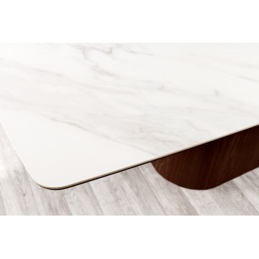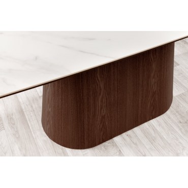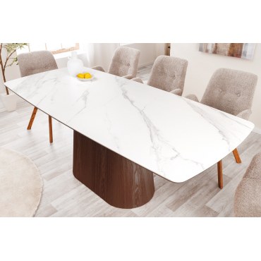 Wprowadź do swojego wnętrza elegancję i nowoczesność dzięki wyjątkowemu stołowi UNIQUE. To doskonałe połączenie luksusowego wyglądu z funkcjonalnością. Owalny blat z wytrzymałej ceramiki w wykończeniu imitującym biały marmur idealnie komponuje się z podstawą w kolorze drewna orzechowego, tworząc spójną, harmonijną całość.