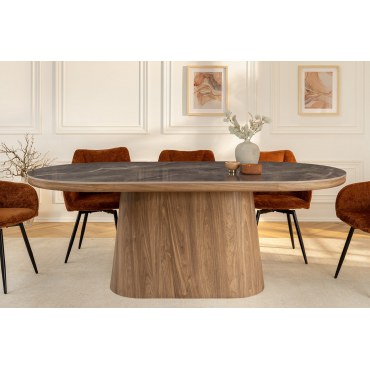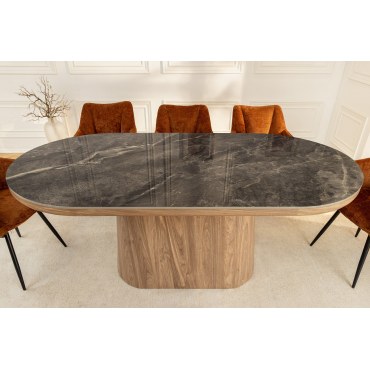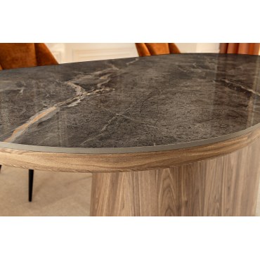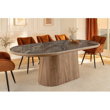Elegancki i nowoczesny stół Unique łączy minimalistyczny, owalny design z wysokiej jakości wykonaniem. Fornirowane elementy w kolorze orzecha pięknie kontrastują z ceramicznym blatem o szarym, marmurowym wzorze. Produkt łączy trwałość i styl, idealny zarówno do eleganckich jadalni, jak i nowoczesnych przestrzeni reprezentacyjnych.