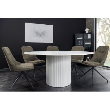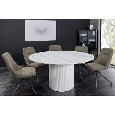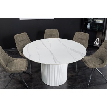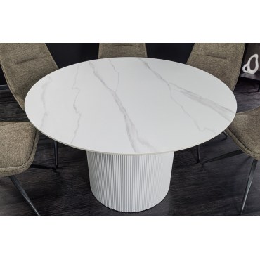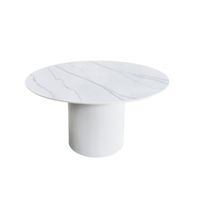 Nowoczesny i stylowy stół UNIQUE – idealny do jadalni, kuchni czy salonu. Okrągły blat z ceramiki w białym marmurowym efekcie dodaje lekkości i elegancji, a biały stelaż harmonijnie wpasowuje się w jasne, minimalistyczne wnętrza.