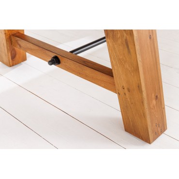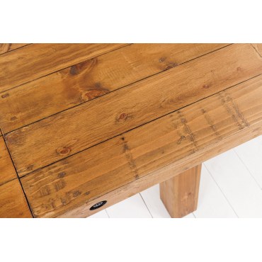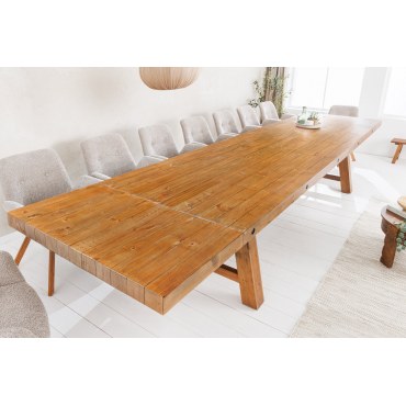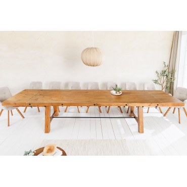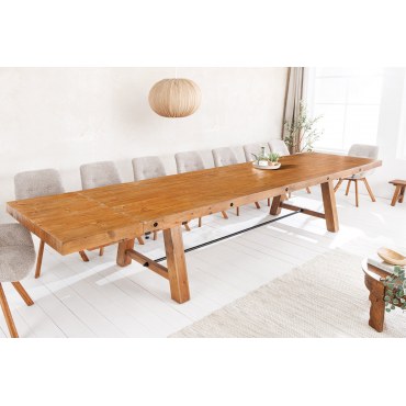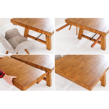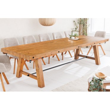 Wyjątkowo masywny, rozkładany stół jadalniany z litego drewna sosnowego w ciepłym wybarwieniu Vintage Brown. Gruby blat 80 mm i solidna konstrukcja zapewniają stabilność, a funkcja przedłużenia do 400 cm daje komfort podczas rodzinnych spotkań i większych przyjęć.