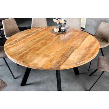 IRON CRAFT to stół, który łączy naturalne piękno litego drewna z mocnym, industrialnym charakterem metalu. Jego okrągły blat o średnicy 140 cm wykonany jest z drewna mango w naturalnym odcieniu, z widocznym usłojeniem i unikalną strukturą — każdy egzemplarz jest jedyny w swoim rodzaju.