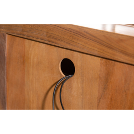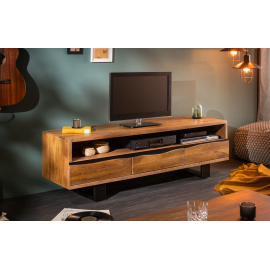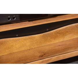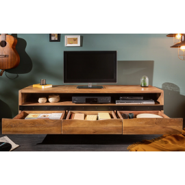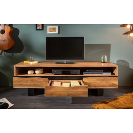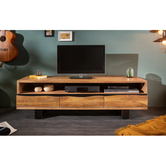 Szafka RTV została wykonana z litego drewna akacjowego, co zapewnia jej trwałość i unikalny charakter. Mebel wyposażono w trzy szuflady o wymiarach: szerokość 45 cm, wysokość 8 cm, głębokość 35 cm. Pod blatem znajduje się otwarta przestrzeń o wymiarach: szerokość 154 cm, wysokość 15 cm, głębokość 48 cm. Stabilną podstawę szafki stanowi metalowa konstrukcja w kolorze czarnym o wysokości 13 cm.