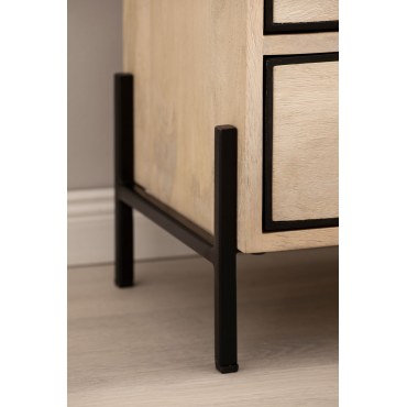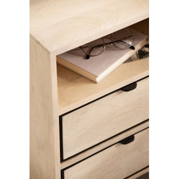 Ten praktyczny stolik nocny łączy nowoczesny design z naturalnym urokiem drewna mango. Dzięki dwóm szufladom i otwartej półce oferuje wystarczająco dużo miejsca na przechowywanie najpotrzebniejszych przedmiotów przy łóżku. Idealny do wnętrz w stylu loftowym, skandynawskim i nowoczesnym.