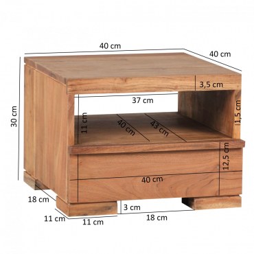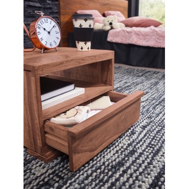 Ten masywny stolik nocny w pięknym, wiejskim stylu zachwyca wyjątkowym usłojeniem drewna akacjowego. Idealny do przechowywania drobiazgów dzięki praktycznej szufladzie oraz otwartej półce.