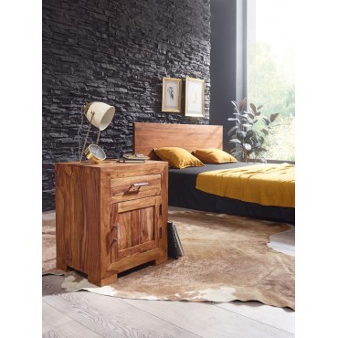 Wyrazista struktura litego drewna Sheesham oraz eleganckie metalowe uchwyty na szufladzie i drzwiczkach tworzą wyjątkowy charakter tego mebla.