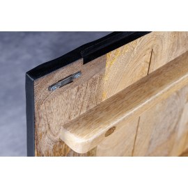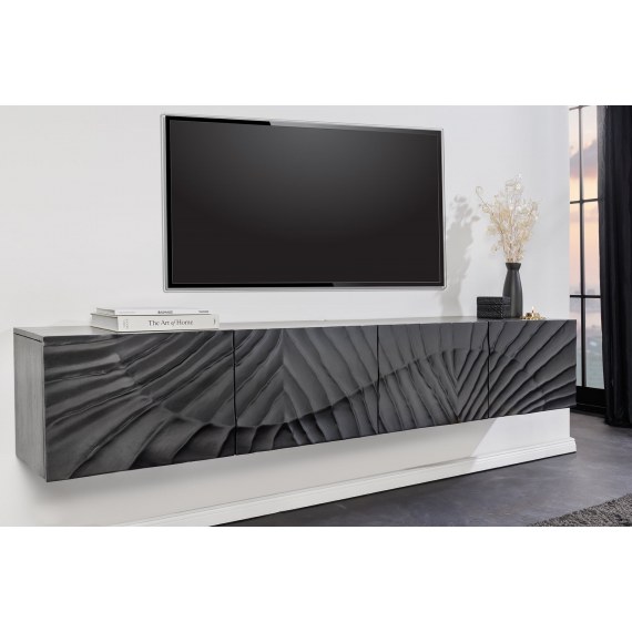 Szafka RTV SCORPION to elegancki i nowoczesny mebel, który łączy funkcjonalność z minimalistycznym designem. Wykonana z litego drewna mango w czarnym wykończeniu, prezentuje się luksusowo i doskonale wpisuje się w nowoczesne aranżacje. Wisząca konstrukcja dodaje lekkości i nowoczesnego charakteru każdemu wnętrzu.