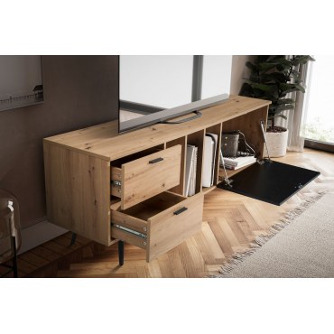 Wprowadź do swojego salonu nowoczesny styl z tą elegancką szafką RTV w dekorze dębowym. Kontrastujący front w kolorze czarnym nadaje meblowi wyrazistości, a prosta forma i przemyślany układ zapewniają nie tylko estetykę, ale i praktyczne przechowywanie.