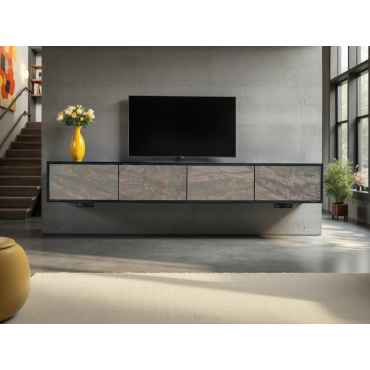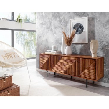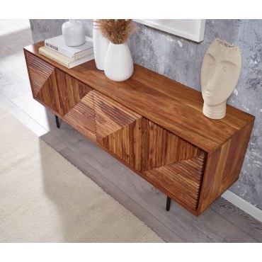 Ta wyjątkowa szafka RTV to połączenie naturalnego uroku egzotycznego drewna Sheesham z nowoczesnym designem. Ręcznie wykonana komoda zachwyca efektowną trójwymiarową strukturą frontów oraz wyrazistym usłojeniem, które czyni każdy egzemplarz unikalnym.