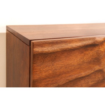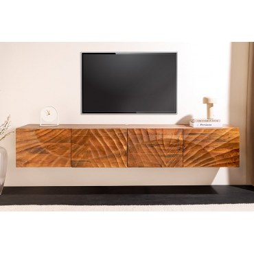 Designerska, wisząca szafka RTV z litego drewna mango w kolorze brązowym. Minimalistyczna bryła i niska wysokość zapewniają nowoczesny wygląd i wygodne prowadzenie kabli. Mebel świetnie sprawdzi się pod telewizorem w salonie lub pokoju dziennym.