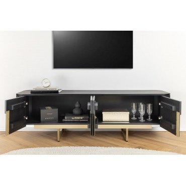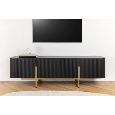 Wprowadź do salonu klimat art déco. Szafka RTV GATSBY łączy solidne drewno mango wykończone na głęboki mat/czerń ze złotą, metalową podstawą. Zaokrąglone boki i minimalistyczny front tworzą elegancki, ponadczasowy mebel, który pomieści cały Twój sprzęt RTV.