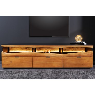 Elegancka i solidna szafka RTV wykonana z litego drewna akacjowego, która łączy naturalne piękno z nowoczesnym designem. Każdy egzemplarz jest unikatowy dzięki naturalnemu usłojeniu drewna oraz surowej, nieregularnej krawędzi blatu. Wbudowane oświetlenie LED subtelnie podkreśla strukturę drewna i tworzy przyjemną atmosferę w salonie.