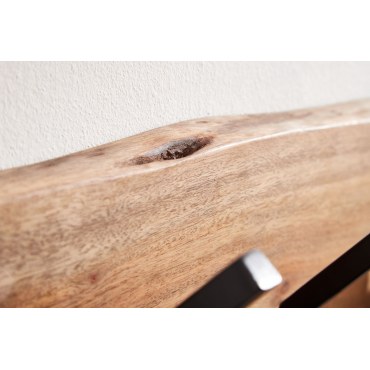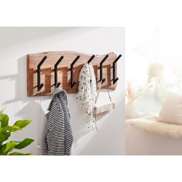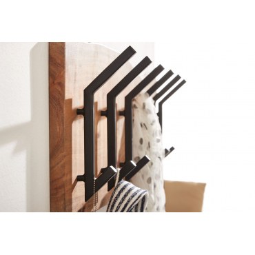 Stylowa i funkcjonalna garderoba ścienna to idealne połączenie naturalnego drewna z industrialnym akcentem metalu. Wykonana ręcznie z litego drewna akacjowego, zachwyca unikalną krawędzią w formie naturalnej linii drzewa. Sześć podwójnych, czarnych haków zapewnia dużo miejsca na kurtki, płaszcze i dodatki.